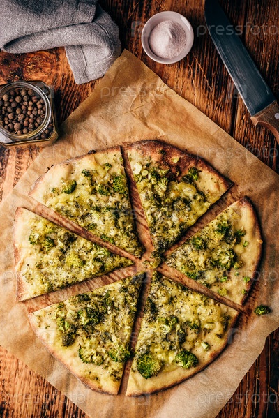 Нарезанная пицца с брокколи, зеленью и пармезаном