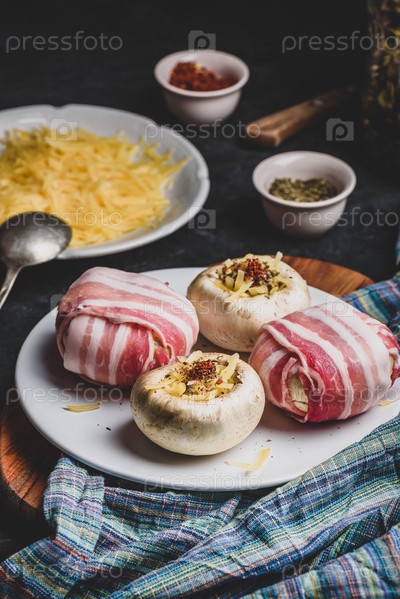 Шампиньоны в беконе, фаршированные сыром