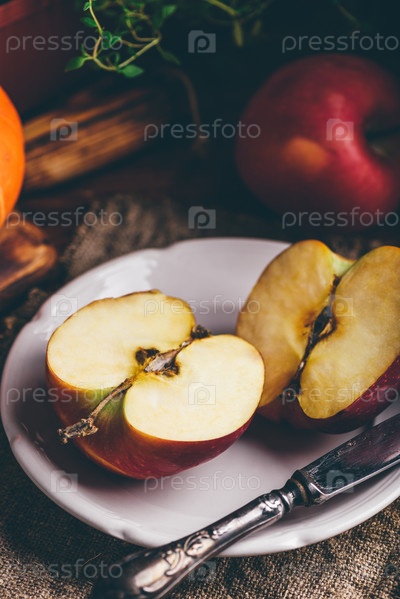 Две половинки красного яблока на белой тарелке со старинным ножом в деревенской обстановке