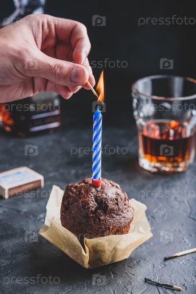 зажженная свеча на кексе на день рождения