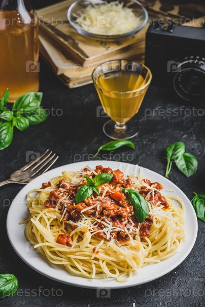Спагетти с соусом болоньезе, пармезаном и базиликом