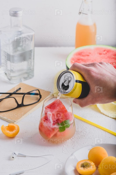 Красный коктейль с замороженными кубиками арбуза, джином и содовой. Рука наливает газировку в стакан для питья