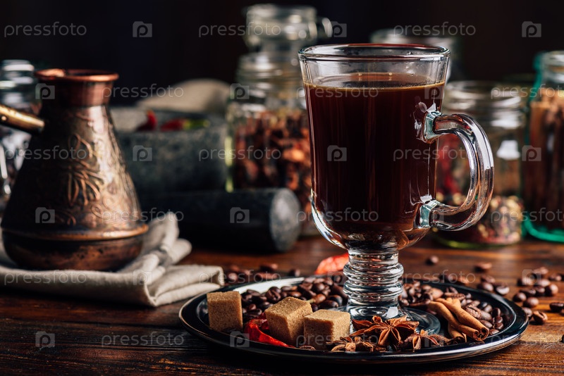 Чашка кофе на тарелке с восточными специями