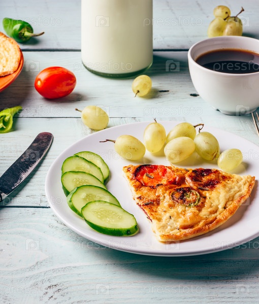 Здоровый завтрак с фриттатой и чашкой кофе на деревянной спинке