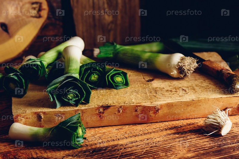 Свежий зеленый лук-порей на разделочной доске