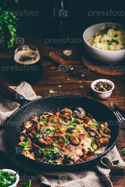 Жареный стейк из свиной шеи с разными грибами