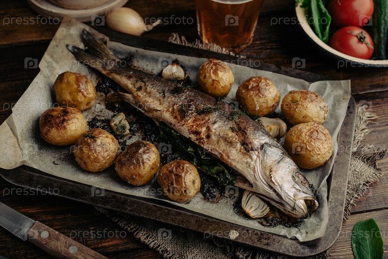 Сибас, фаршированный щавелем и запеченный с молодым картофелем
