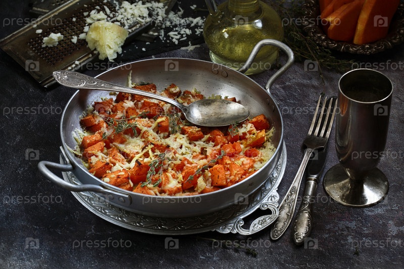 Тыква запеченная с чесноком,специями и сыром на черном фоне