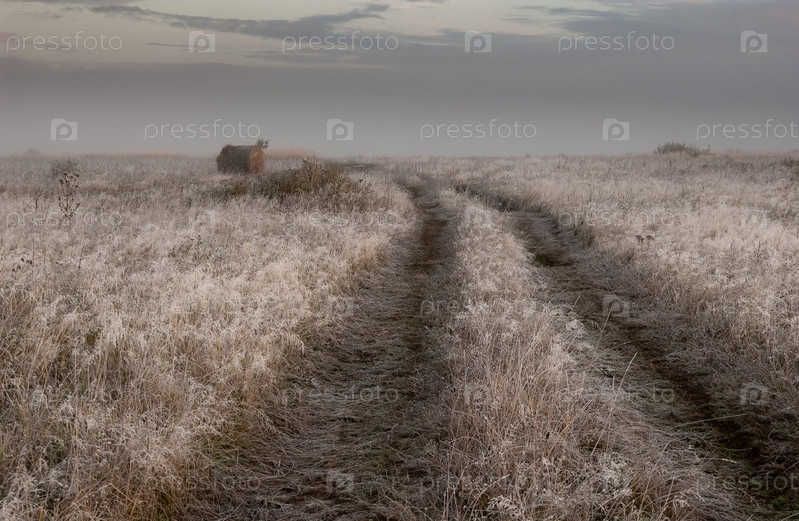 Проселочная дорога в поле, трава покрыта инеем, одиноко лежит у дороги одинокий рулон сена, рассвет. Рязанская область, Россия