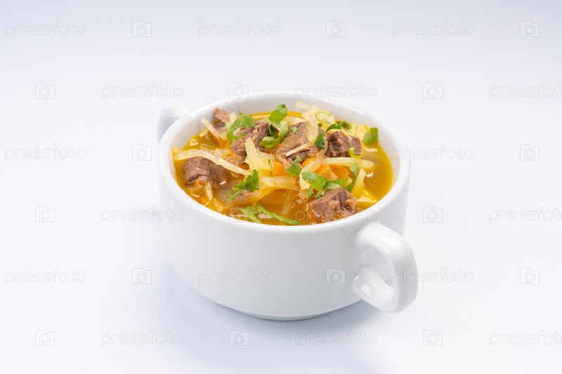 Традиционный русский суп из капусты и мяса в белой миске на белом фоне