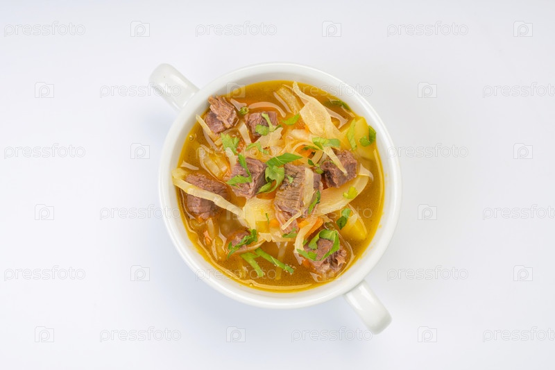 Традиционный русский суп из капусты и мяса в белой миске на белом фоне