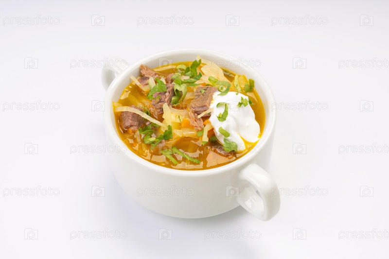 Традиционный русский суп из капусты и мяса в белой миске на белом фоне
