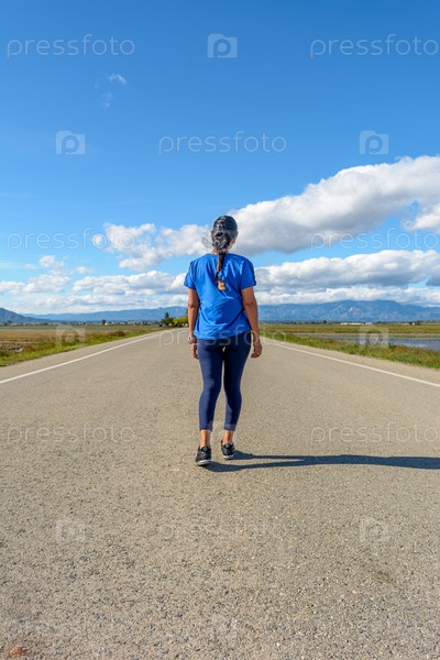 Путешественник в повседневной одежде идет по мощеной дороге к горизонту в спокойной обстановке, вид сзади на латиноамериканку, одетую в синее, идущую по дороге в природном парке Дельта Эбро, Таррагона, Каталония, Испания