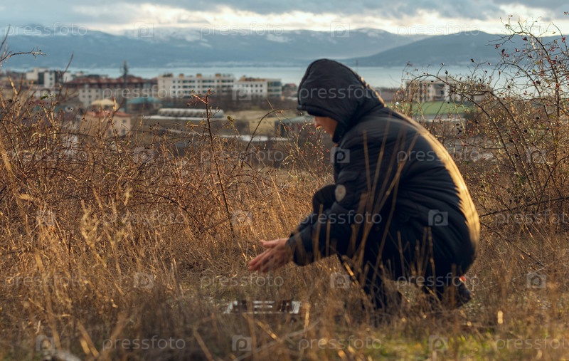 Индивидуальный путешественник, человек, путешествующий один, зажигает туристическую печь, греет руки в горном походе, ведет активный здоровый образ жизни, приключенческий отдых