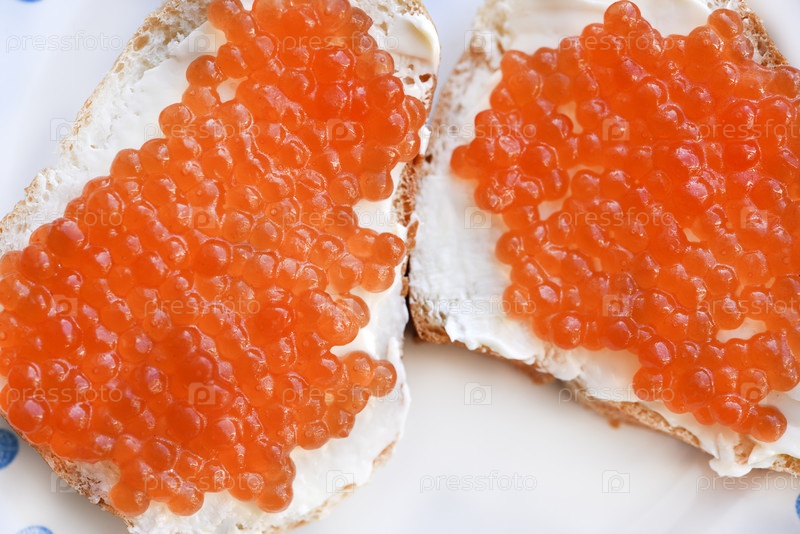 Красная икра лосося на хлебе с маслом. Бутерброд с икрой и маслом на тарелке