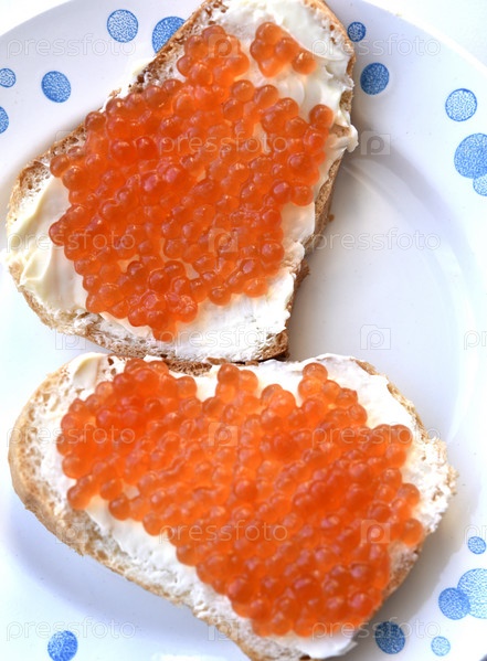 Красная икра лосося на хлебе с маслом. Бутерброд с икрой и маслом на тарелке