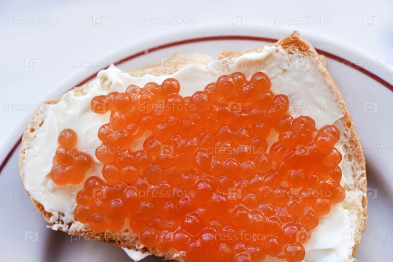 Красная икра лосося на хлебе с маслом. Бутерброд с икрой и маслом на тарелке