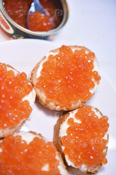 Красная икра лосося на хлебе с маслом. Ложка с красной икрой