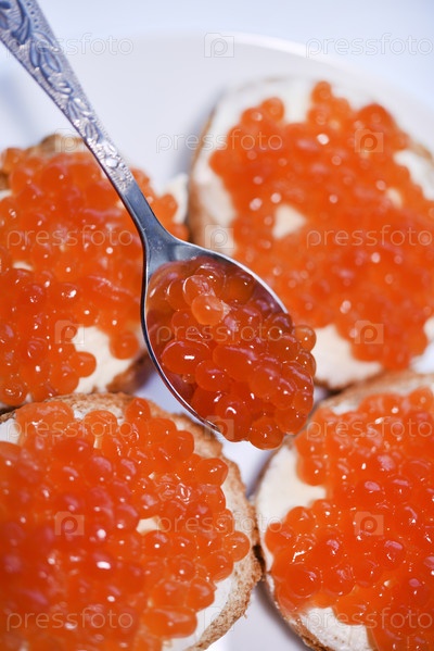 Красная икра лосося на хлебе с маслом. Ложка с красной икрой