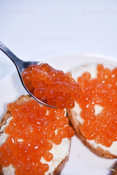 Красная икра лосося на хлебе с маслом. Ложка с красной икрой