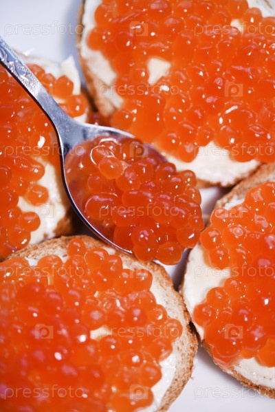 Красная икра лосося на хлебе с маслом. Ложка с красной икрой
