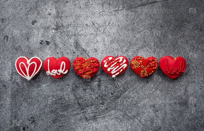Домашнее имбирное печенье в форме сердца в красной сахарной пудре. Вкусное сердце имбирного печенья на сером бетонном фоне. Свежеиспеченные пряники ко Дню святого Валентина