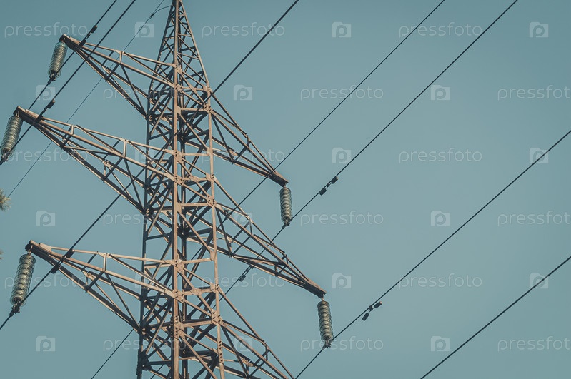 Поддержка высоковольтной линии электропередачи. Обеспечение городов электроэнергией. Крупный план, выборочный фокус