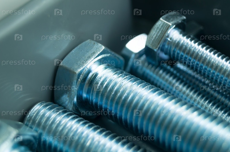 Большие болты крепления. Новые крепления в ящике для инструментов. Металлический болт крупным планом. Селективный фокус