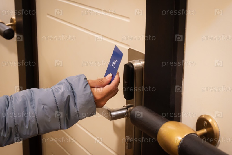 Крупный план руки, держащей ключ-карту, чтобы открыть дверь отеля
