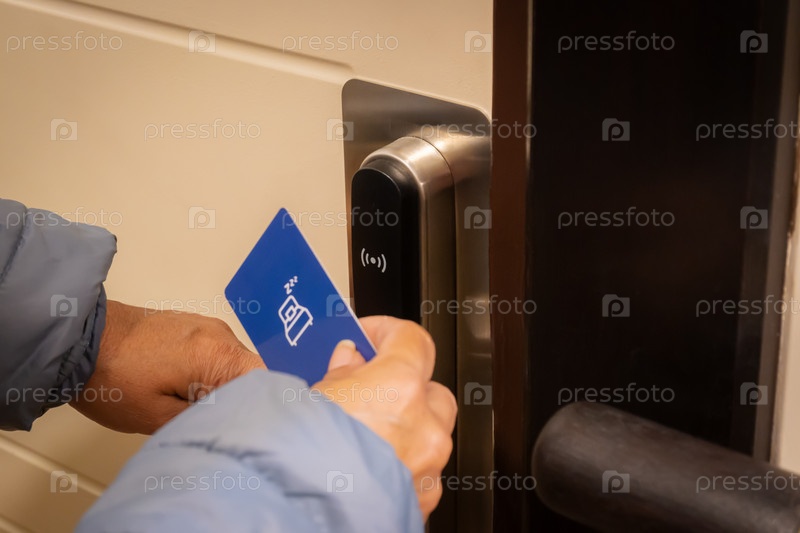 Обрезанный вид туристки, использующей карту-ключ, чтобы открыть электронную дверь в роскошном отеле