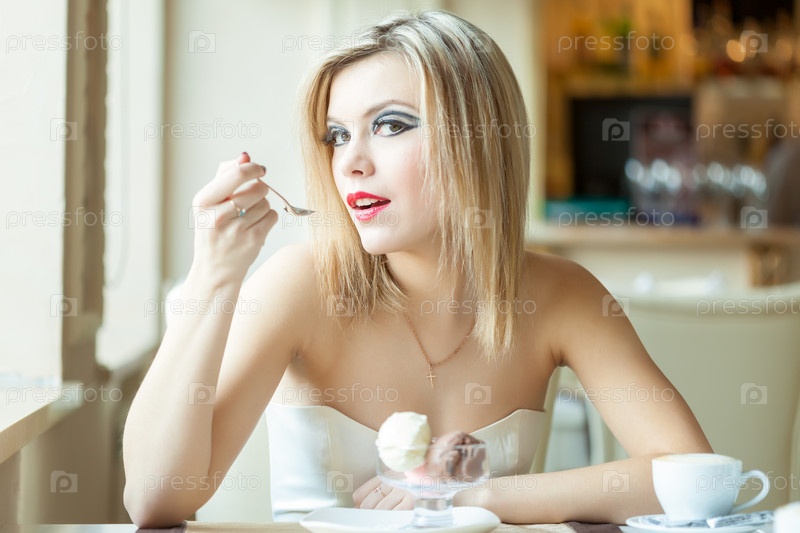 Женщина ест мороженое в ресторане