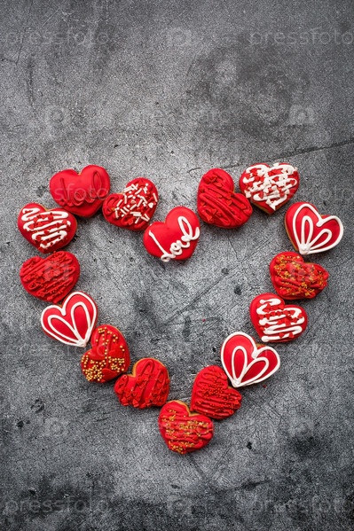 Домашнее имбирное печенье в форме сердца в красной сахарной пудре. Вкусное сердце имбирного печенья на сером бетонном фоне. Свежеиспеченные пряники ко Дню святого Валентина