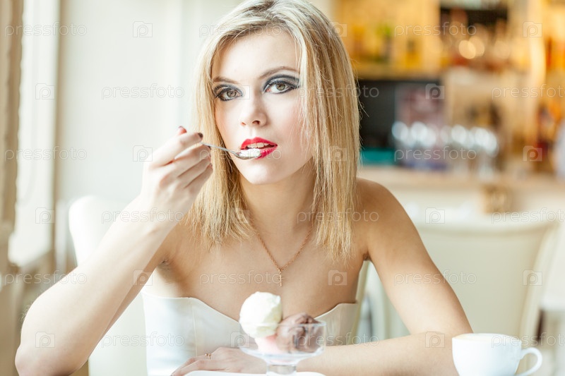 Женщина ест мороженое в ресторане
