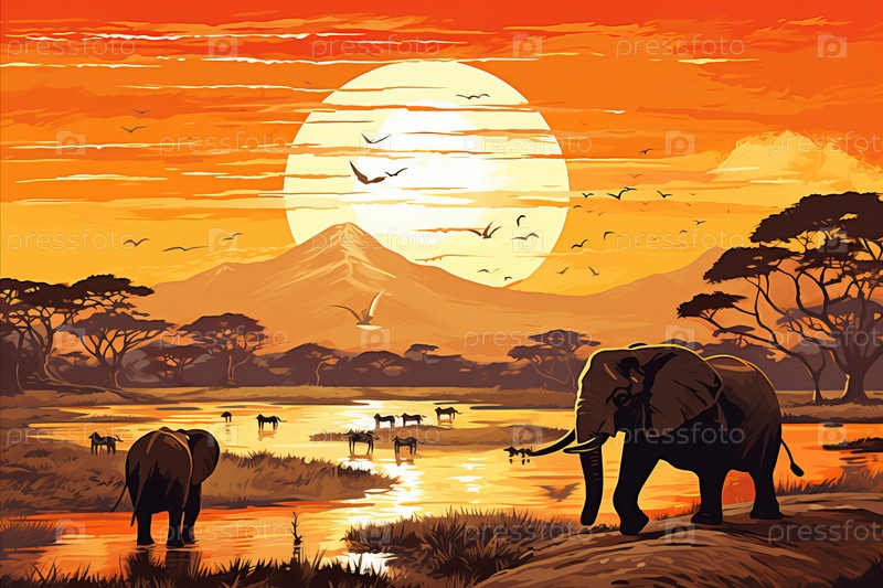 Завораживающий закат африканской саванны. величественная дикая природа в безмятежных золотых сумерках