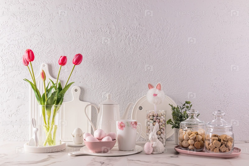 Шикарный кухонный фон в нежных пастельных тонах, украшенный к празднику Пасхи кроликами, цветами, яйцами. Белая посуда