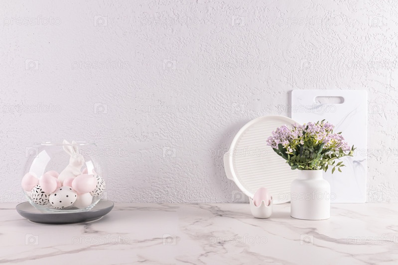 Украшение кухонной столешницы в стиле минимализма к празднику Пасхи. Стеклянная круглая ваза с крашеными яйцами и зайчиком. Ваза с цветами