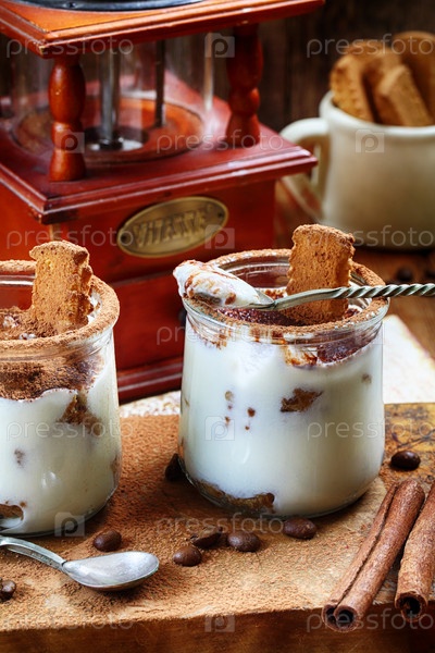 Тирамису с стеклянных стаканах на деревянном фоне