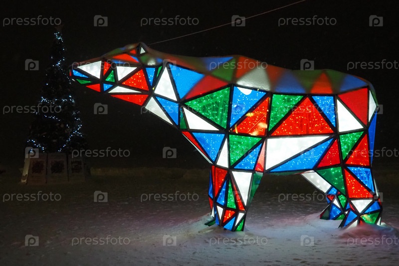 Медвежья гирлянда. Разноцветный сверкающий электрический новогодний рождественский мишка на снегу ночью. Фигура-инсталляция, архитектурная форма для украшения улиц в праздничные дни. Красный, синий, зеленый, белый треугольник