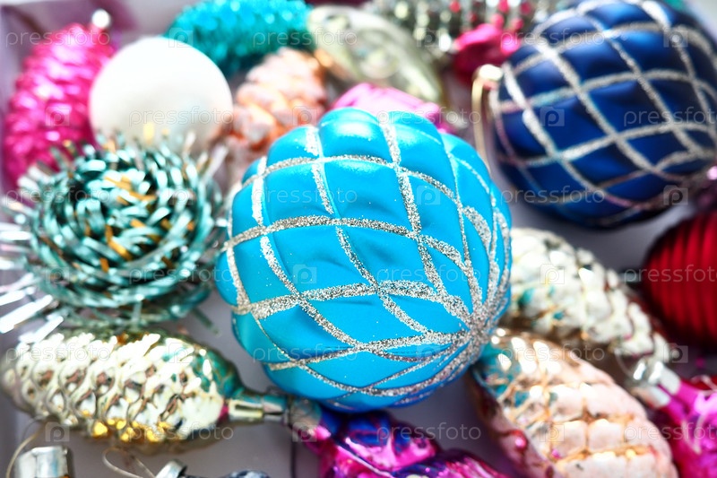 Рождественские шары, конусы из фольги и украшения с золотой мишурой крупным планом. Красивые яркие декоративные шары современного модного дизайна с переплетающимися полосками. Новый год и Рождество Рождество