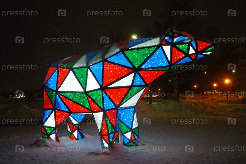 Медвежья гирлянда. Разноцветный сверкающий электрический новогодний рождественский мишка на снегу ночью. Фигура-инсталляция, архитектурная форма для украшения улиц в праздничные дни. Красный, синий, зеленый, белый треугольник