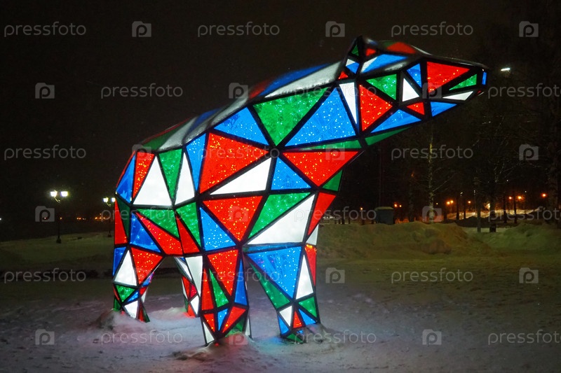 Медвежья гирлянда. Разноцветный сверкающий электрический новогодний рождественский мишка на снегу ночью. Фигура-инсталляция, архитектурная форма для украшения улиц в праздничные дни. Красный, синий, зеленый, белый треугольник