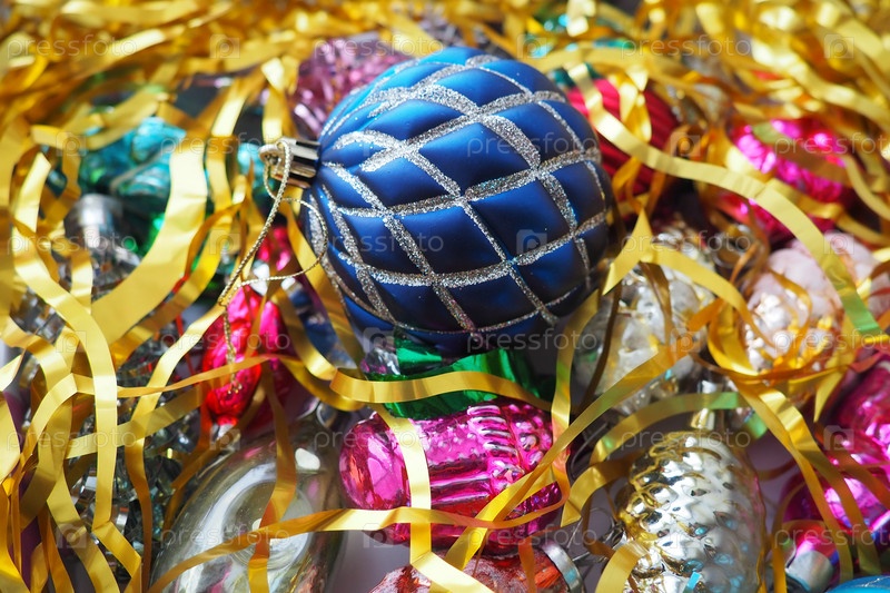 Рождественские шары, конусы из фольги и украшения с золотой мишурой крупным планом. Красивые яркие декоративные шары современного модного дизайна с переплетающимися полосками. Новый год и Рождество Рождество