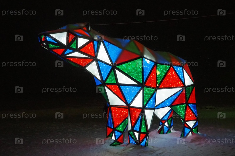 Медвежья гирлянда. Разноцветный сверкающий электрический новогодний рождественский мишка на снегу ночью. Фигура-инсталляция, архитектурная форма для украшения улиц в праздничные дни. Красный, синий, зеленый, белый треугольник
