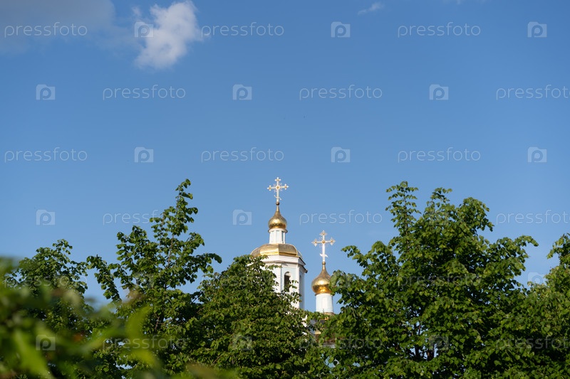 Православная белая церковь с крестом летом