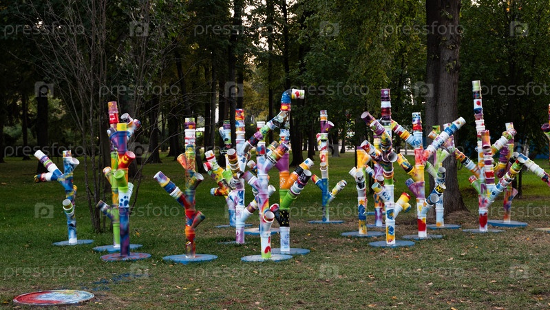 Скульптуры в виде деревьев из крашеных пластиковых банок