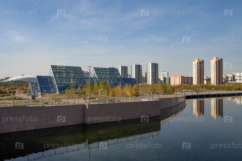 Ботанический сад на фоне озера в городе Астана (Республика Казахстан)