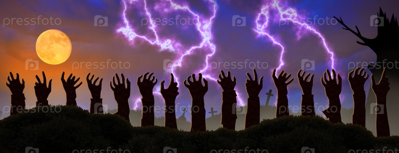 Руки зомби вылезают из земли на фоне полной луны