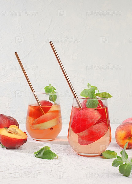 Концепция детокс-диеты и очищения организма. Освежающий домашний лимонадный коктейль со свежими яблоками, персиками и мятой. Фруктовый сок и ингредиенты, концепция похудения, здоровая и натуральная еда,
