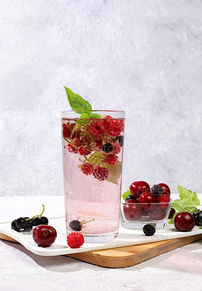 Концепция детокс-диеты и очищения организма. Освежающий домашний лимонадный коктейль со свежими ягодами и мятой. Фруктовый сок и ингредиенты, концепция похудения, здоровая и натуральная еда, избирательный фокус