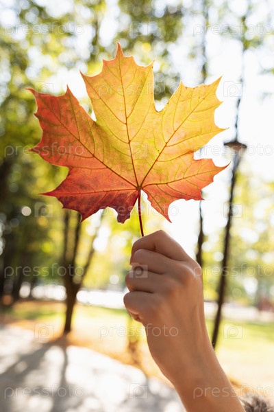Мужчина держит в руке осенний кленовый лист, освещенный солнечным светом сзади, на фоне парка
